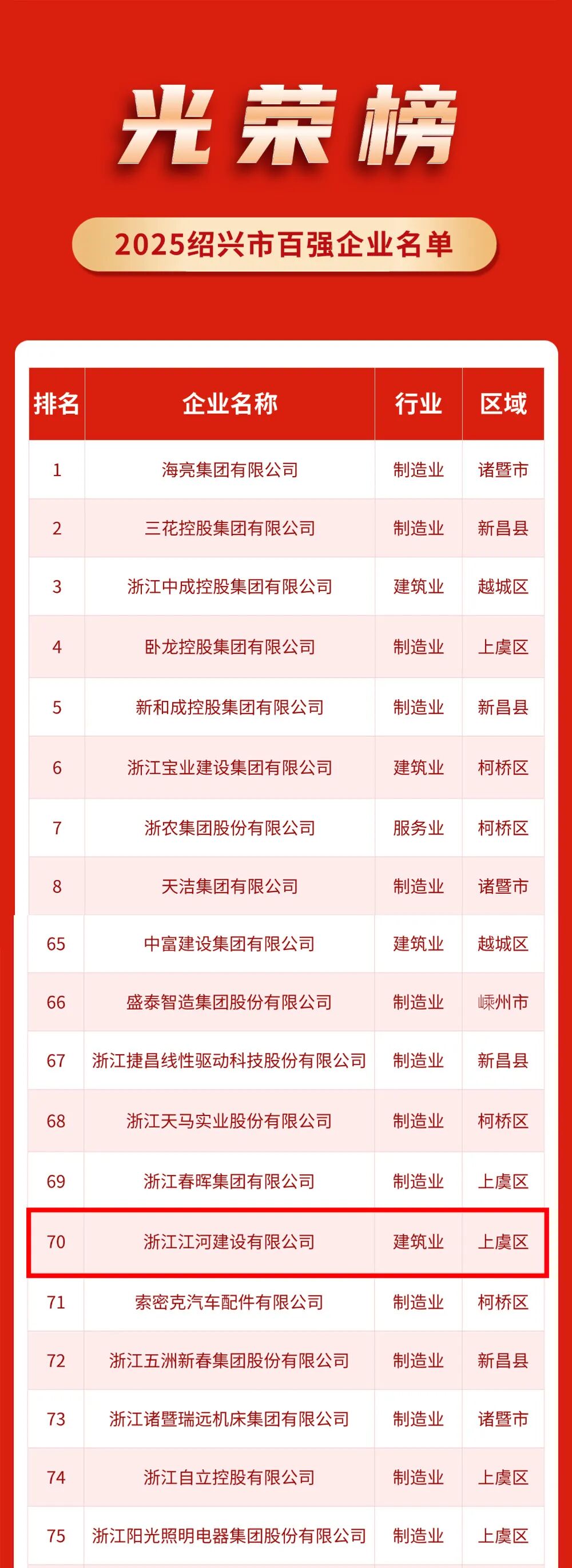 近日,紹興市企業聯合會、紹興市企業家協會聯合發布2025紹興市百強企業榜單,浙江江河建設有限公司位列...