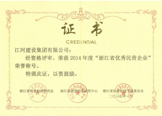 江河建設集團有限公司被浙江省民營經濟研究會、浙江省民營經濟研究中心、浙江省民營經濟專家委員會授予2014年度“浙江省優秀民營企業”榮譽稱號。