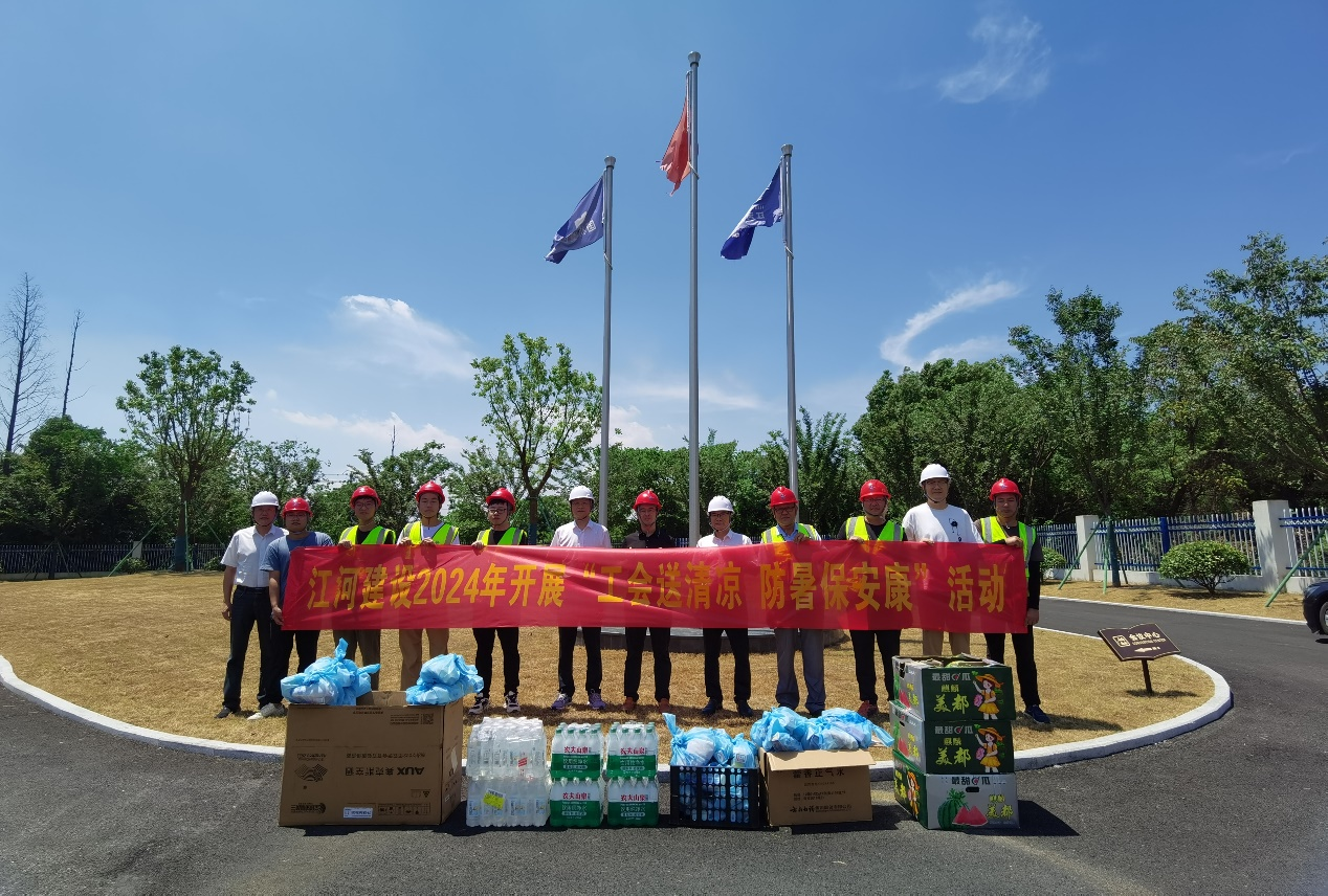 盛夏焦月,驕陽似火,江河建設各重點在建工程項目正在有序推進,一線的職工們備受“烤”驗。為有效改善職工生產生活條件,認真做好高溫天氣職工勞動保護工作。連日來,江河建設黨總支、工會組織開展“工會送清涼,防暑保安康”為主題的高溫慰問活動,成立有工會、總師辦、工程部、安全部等負責人組成的“紅+安全”慰問組,帶著袁偉忠董事長、陳宋江總裁的關懷問候和委托,深入全國各地的項目施工現場,慰問奮戰在高溫一線的項目工人,為其送去礦泉水、毛巾、風油精、西瓜、飲料、藿香正氣水等防暑降溫物品,并為他們的辛勤付出表示感謝。