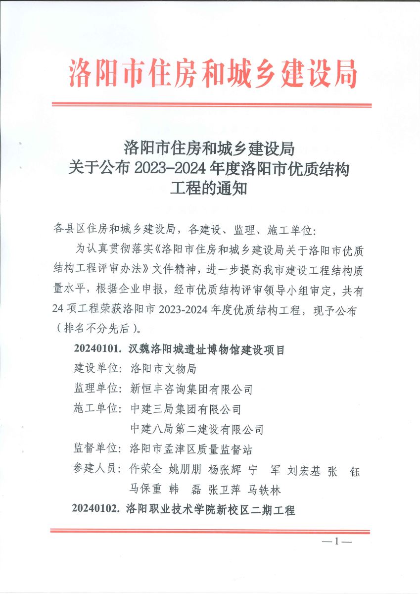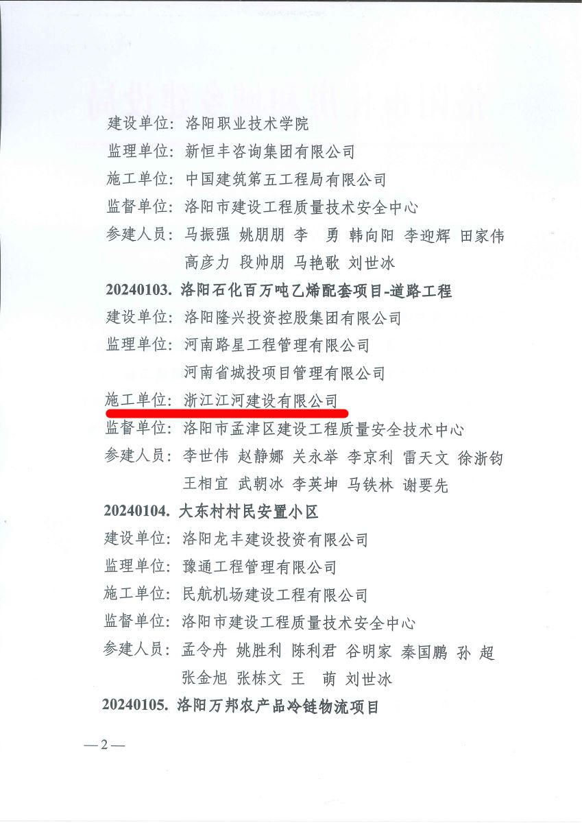 近日,洛陽市住房和城鄉建設局公布了2023-2024年度洛陽市優質結構工程名單,根據《洛陽市住房和城鄉建設局關于洛陽市優質結構工程評審辦法》文件,經市優質結構評審領導小組審定,我公司施工的洛陽石化百萬噸乙烯配套項目道路工程獲此殊榮。